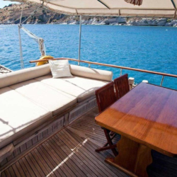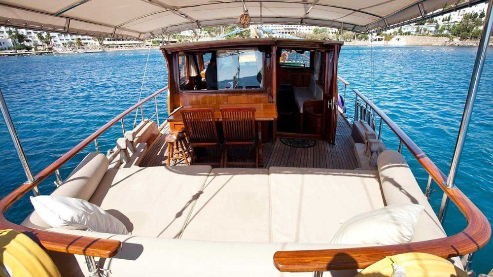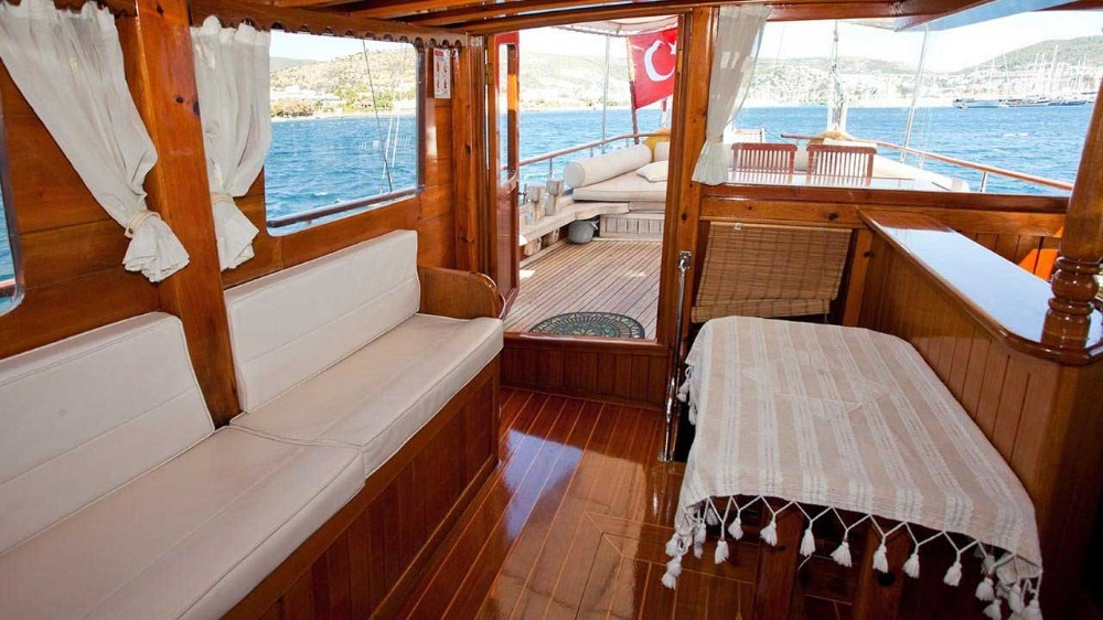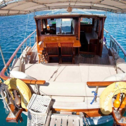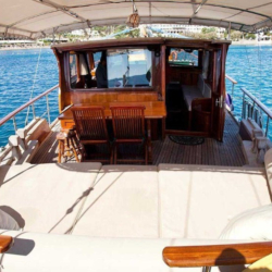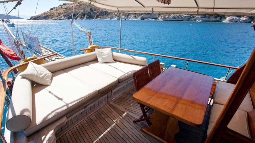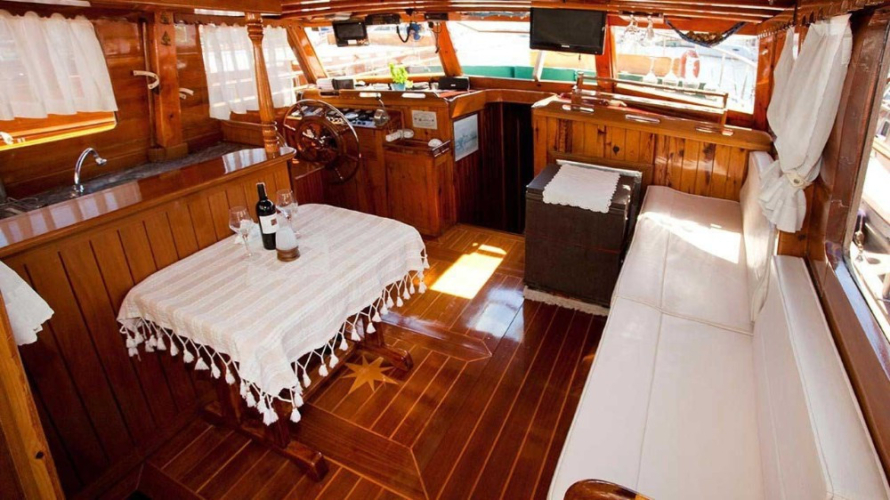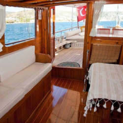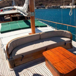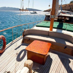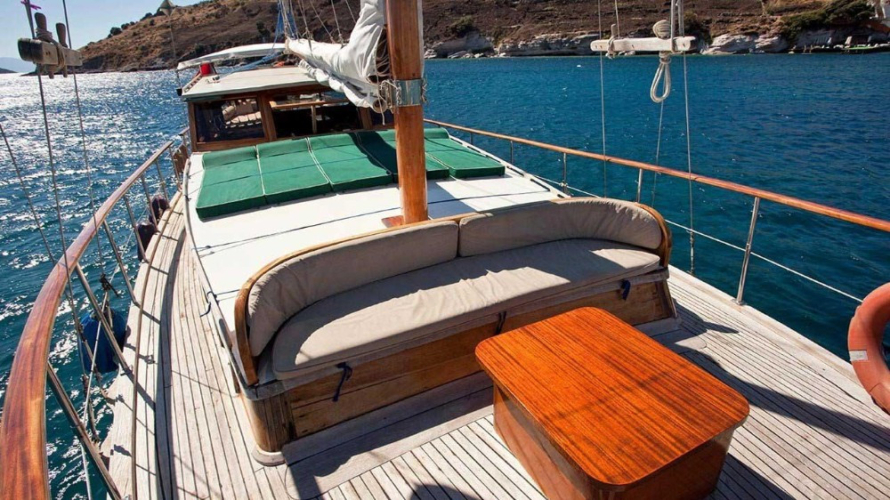 Güverte: Tik ağacı kaplama güverte; arka tarafta oturma grubu ve yemek masası, ön güvertede ise güneşlenme alanı ve oturma bölümü ile rahat ve keyifli vakit geçirme olanağı sunar.