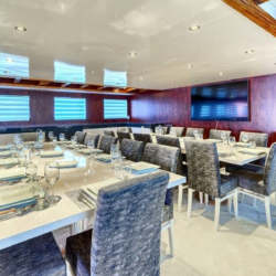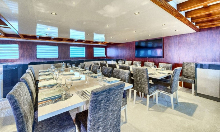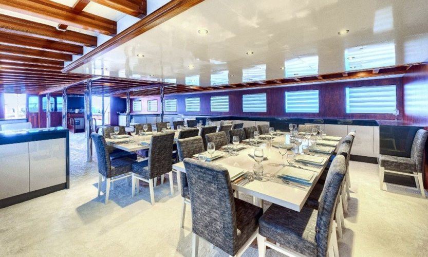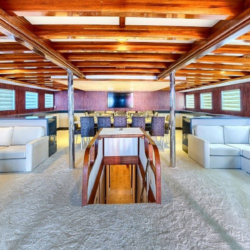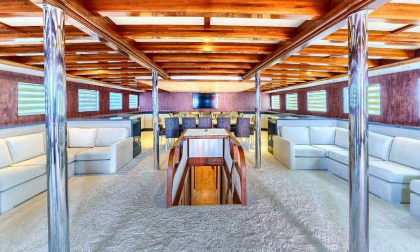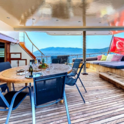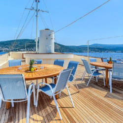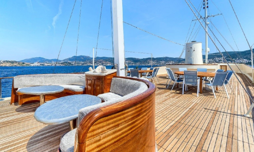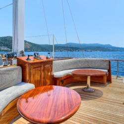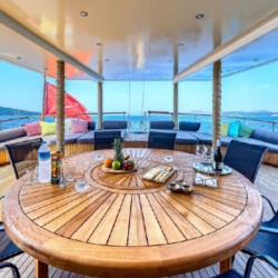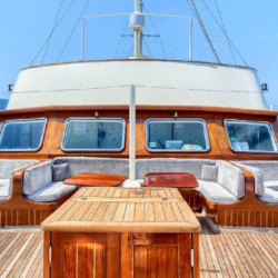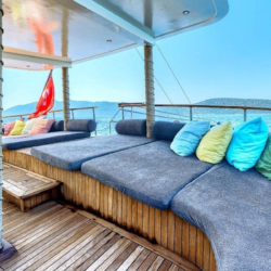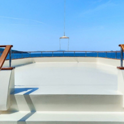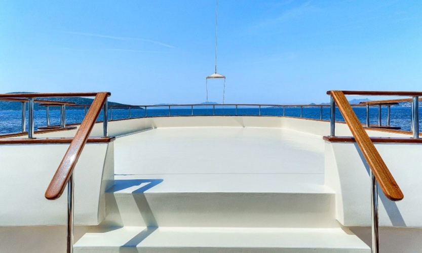 Tik kaplı güvertede ön ve arka oturma alanları, güneşlenme alanları, jakuzili flybridge, yemek masası ve denize iniş merdiveni ile her anınız keyif dolu geçer.