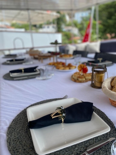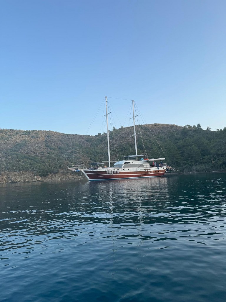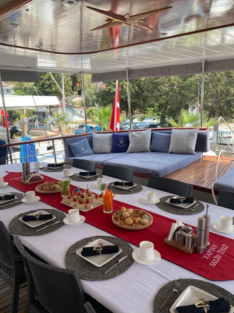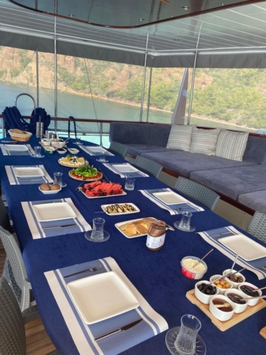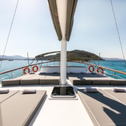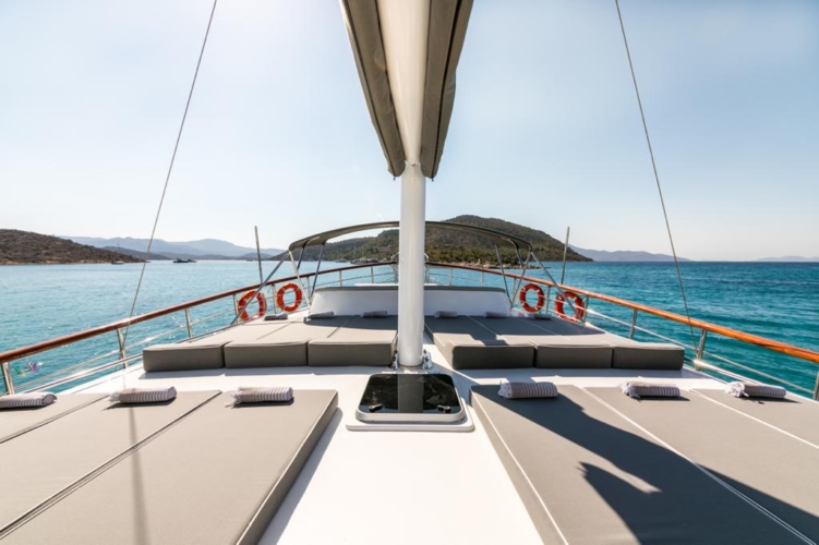 - Geniş Güverte: Guletin geniş güvertesi, güneşlenme minderleri ve oturma alanlarıyla gün boyunca denizin keyfini çıkarmanıza olanak tanır. Ayrıca yemek alanları, açık havada lezzetli yemekler yiyebileceğiniz şekilde dizayn edilmiştir.