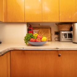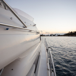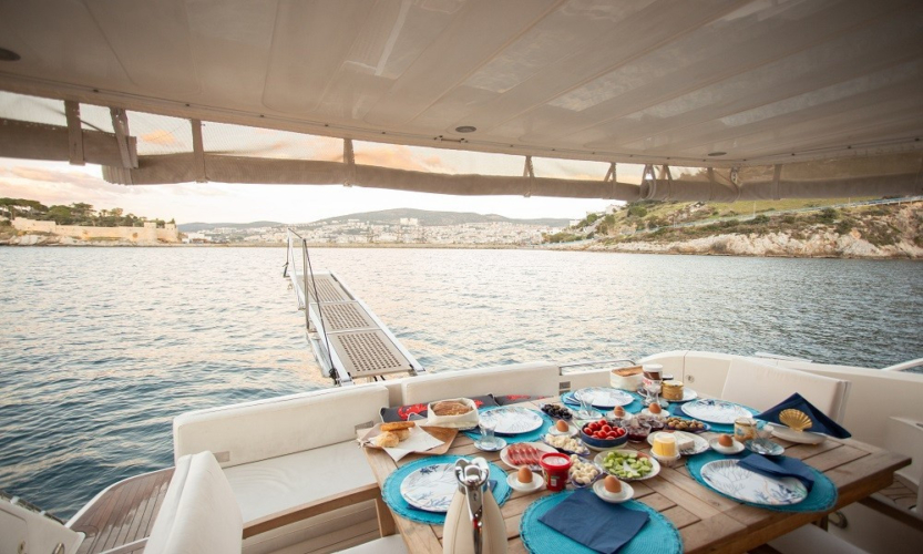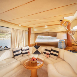 Tik ağacı zeminli güvertesi; arka ve ön kısımlarda oturma ve güneşlenme alanlarıyla keyif sunarken, flybridge bölümü açık havada yemek ve dinlenme imkânı tanır. Uydu anteni, tam güvenlik donanımı ve navigasyon ekipmanları ile her şey hazır.