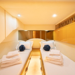 1 Master, 1 Twin ve 1 Convertible kabinde; klima, özel banyo, müzik sistemi ve saç kurutma makinesi gibi tüm konforlar düşünülmüştür. Salonda yemek masası, oturma grubu, LCD TV, müzik sistemi ve Netflix bulunmaktadır.